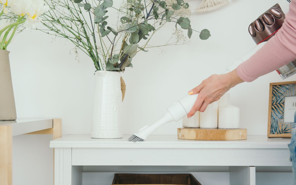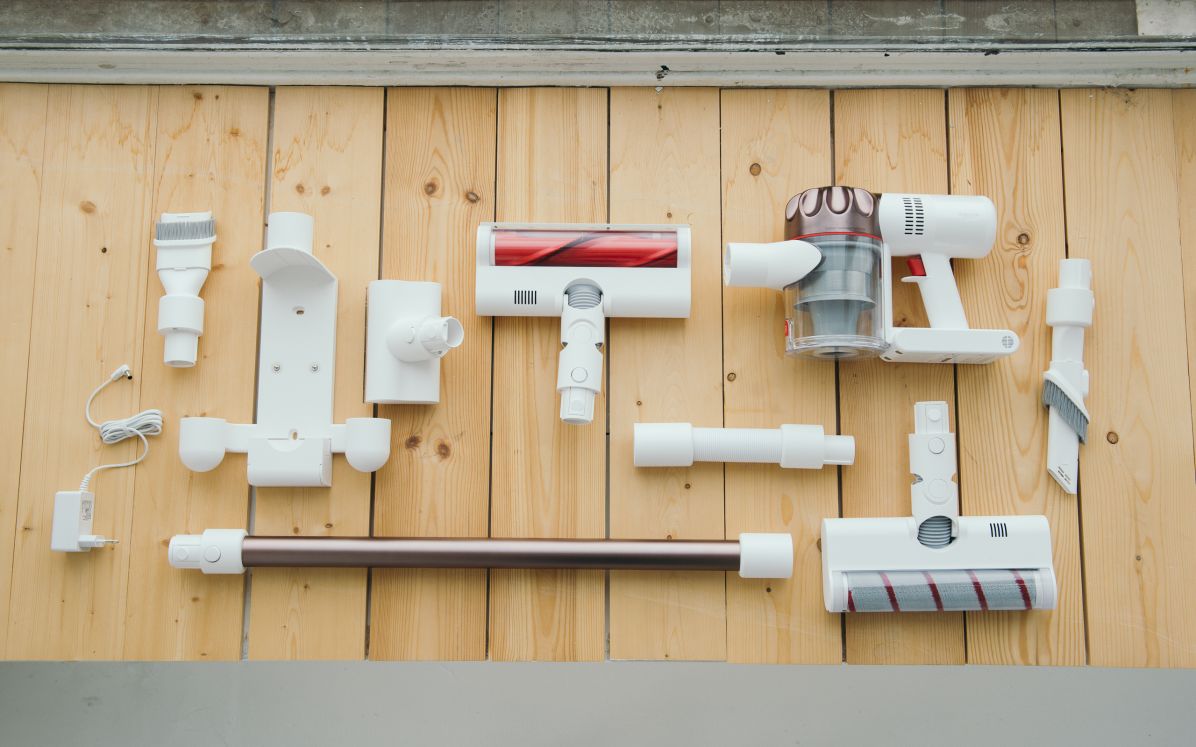 Попадая внутрь пылесоса, пыль и мусор проходят через пять ступеней фильтрации, в том числе HEPA-фильтр, и оседают в контейнере ёмкостью 0,5 литра. На нём есть отметка, подсказывающая, когда его пора опустошить, сделать это можно с помощью выделенной кнопки. То же касается и подсоединения аксессуаров: одним нажатием получилось быстро поменять насадки, не тратя зря время и заряд аккумулятора. Всего насадок в комплекте пять: стандартная для уборки пола с роликом большого диаметра, мягкая щётка для чистки ковров с двойной внутренней спиралью, комбинированная плоская щётка 2-в-1 (уборка с щетиной и без), насадка для обработки тканей, а также щётка для избавления постельного белья и одежды от пылевых клещей. Последние две можно комбинировать с идущим в комплекте гибким удлинительным шлангом, чтобы залезать в щели и узкие места, недоступные при использовании стандартной прямой металлической трубки.
