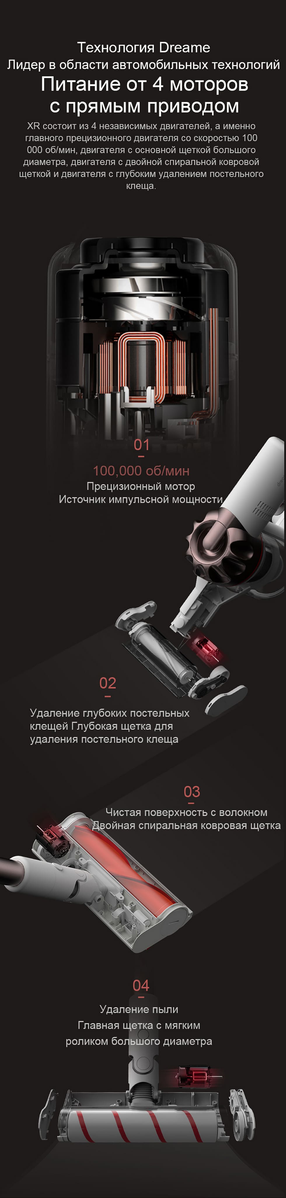 Производителю удалось вместить в лёгкий и компактный корпус достаточно мощный бесщёточный двигатель, который позволяет пылесосу успешно расправляться с попавшимся на пути мусором. Мощность всасывания 145 Вт, примерно такая же как у модели Roidmi X20.Весит Dreame XR всего 1,5 килограмма. Под рукой рычажок для лёгкого переключения между тремя имеющимися режимами мощности. При работе в стандартном режиме можно смело пылесосить под музыку на средней громкости: Dreame XR работает тихо.
