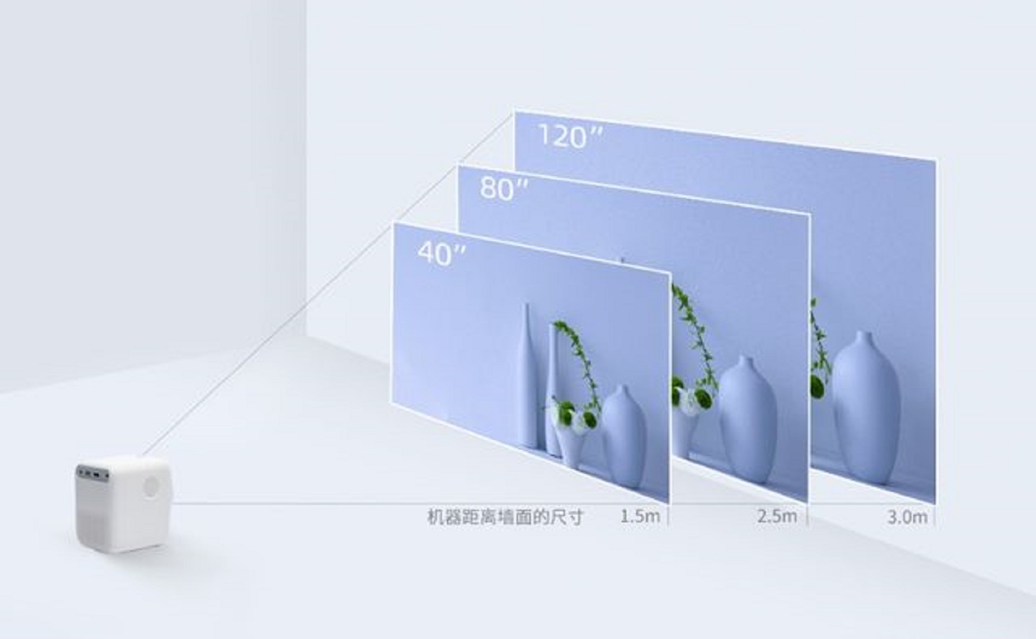 Соотношение сторон проекции – 1.35 :1, с расстояния 1,5 метров ее диагональ составляет 40 дюймов, при 2,5 метров 80 дюймов, а при большем удалении можно добиться диагонали до 120 дюймов.